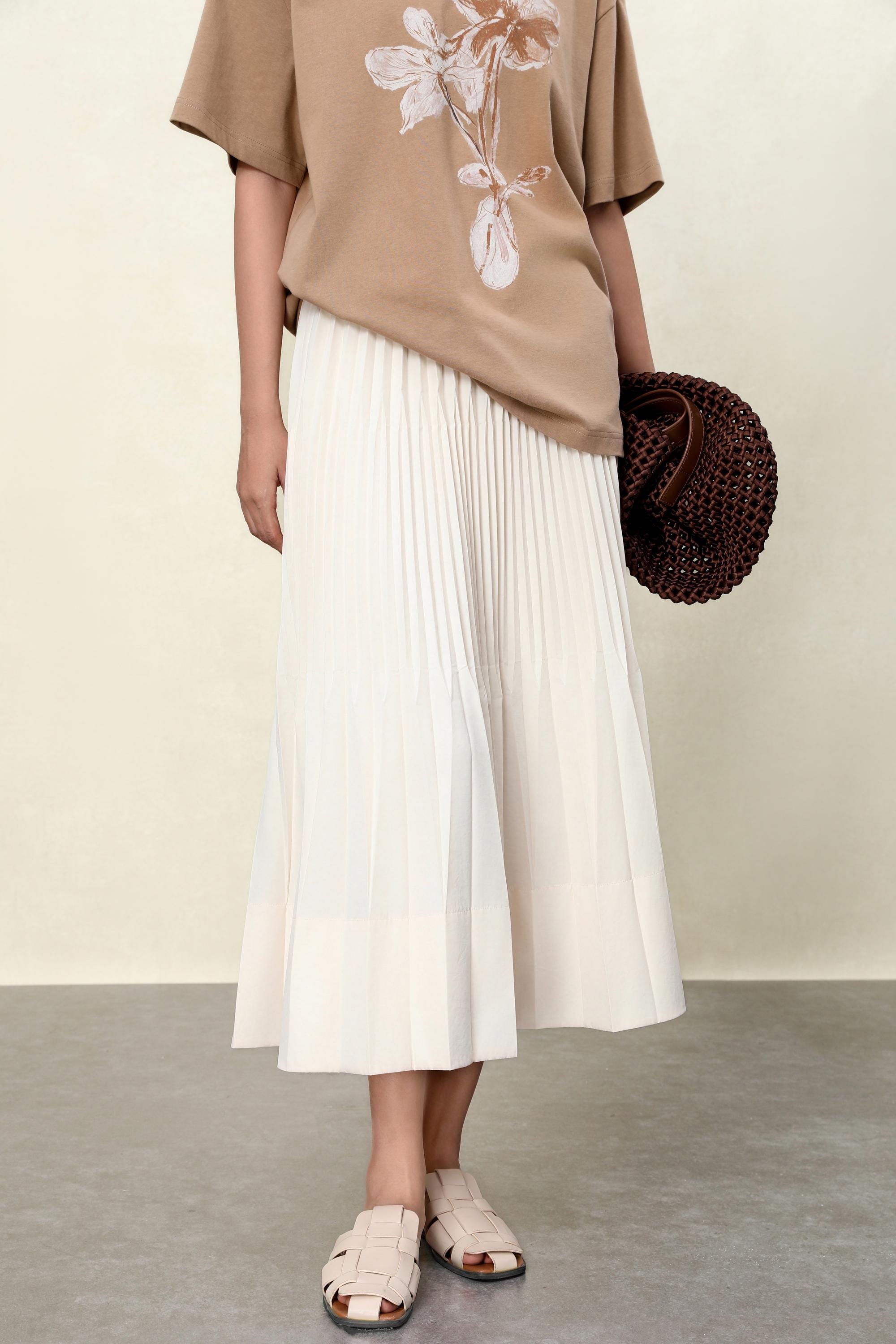 Elegant Beige Pleated Midi Skirt for Women - Vertical Structured Design with Ivory Option