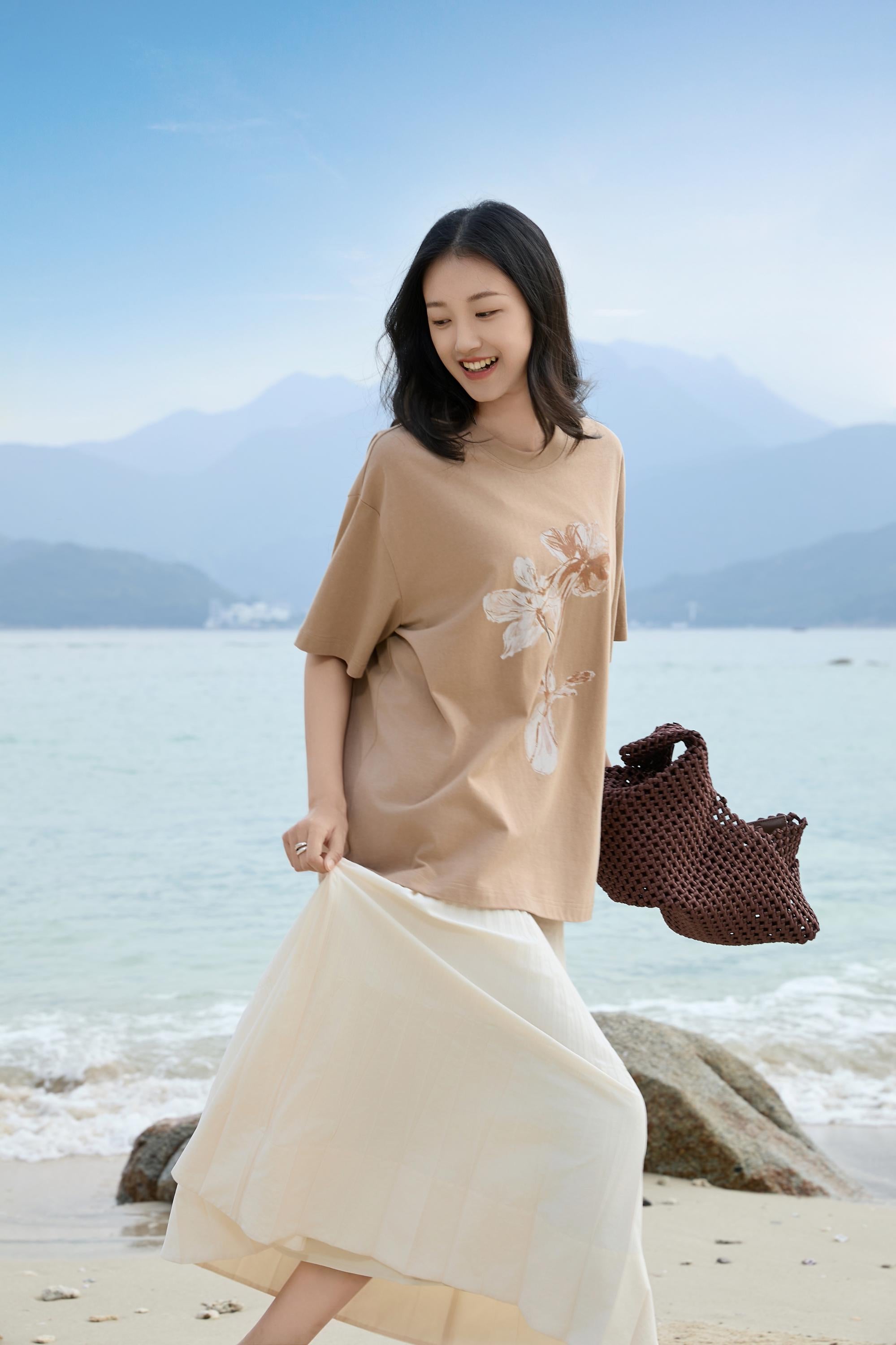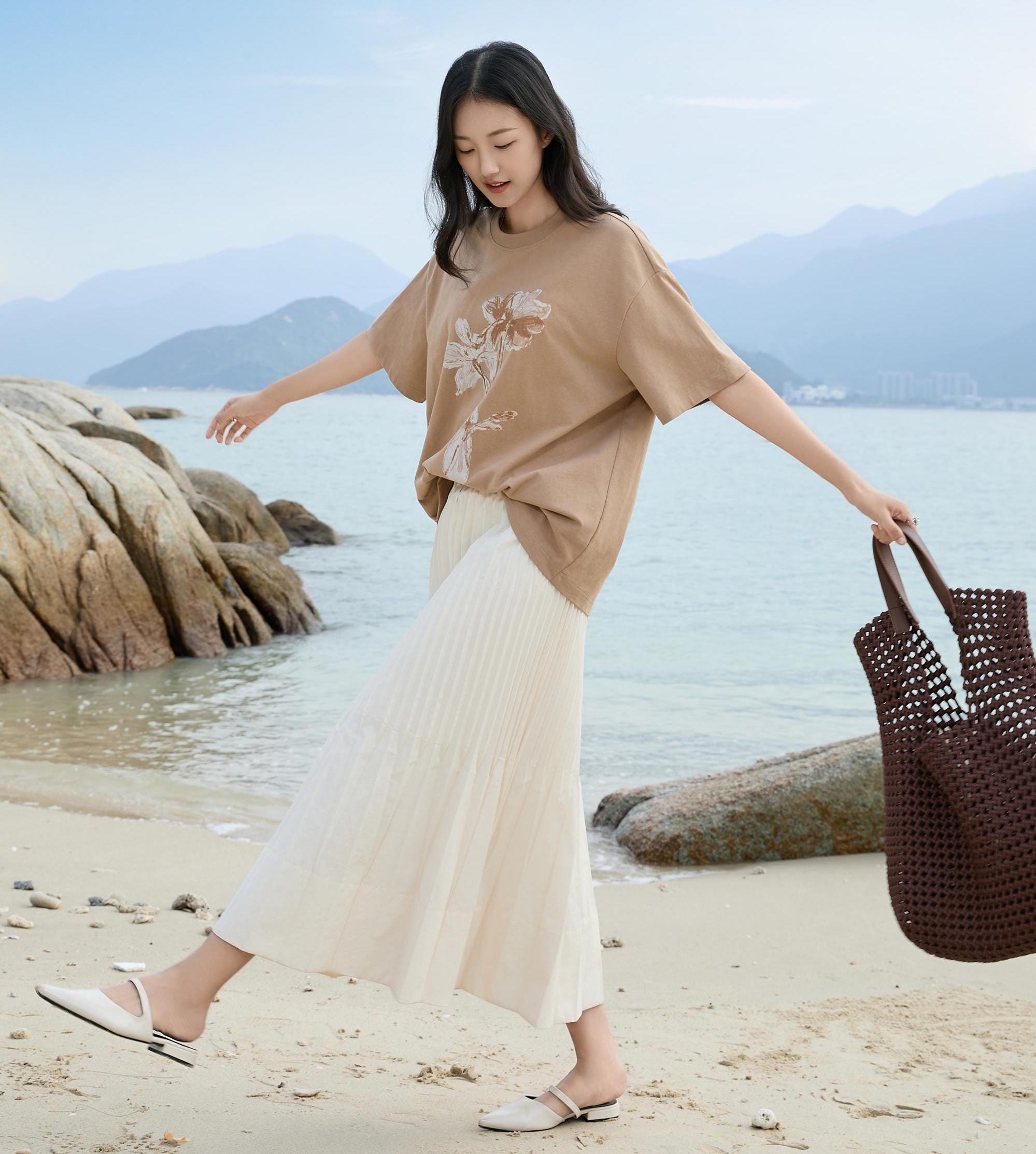 This beige/ivory pleated midi skirt features a vertical pleat design that adds texture, depth, and dimension to the silhouette. The structured pleats create a refined and sophisticated look, enhancing the richness of the fabric while providing a visually elongating effect that makes the wearer appear taller. A perfect blend of elegance and comfort, this skirt is ideal for both casual and formal occasions.