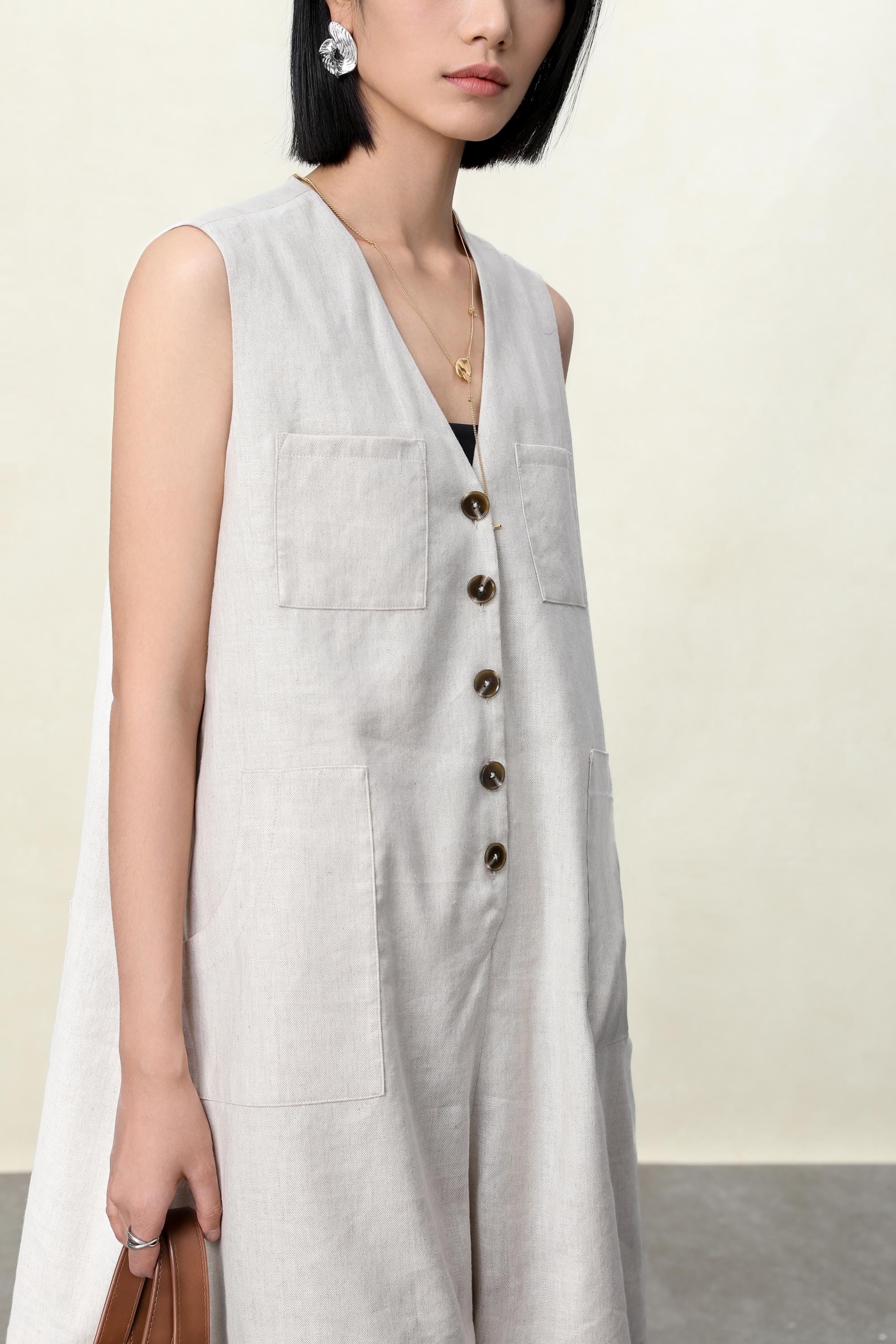 Elegant V-Neck Stonewashed Linen Jumpsuit with Utility Details - A-Line Silhouette for Women | V-Neck Utility Detail