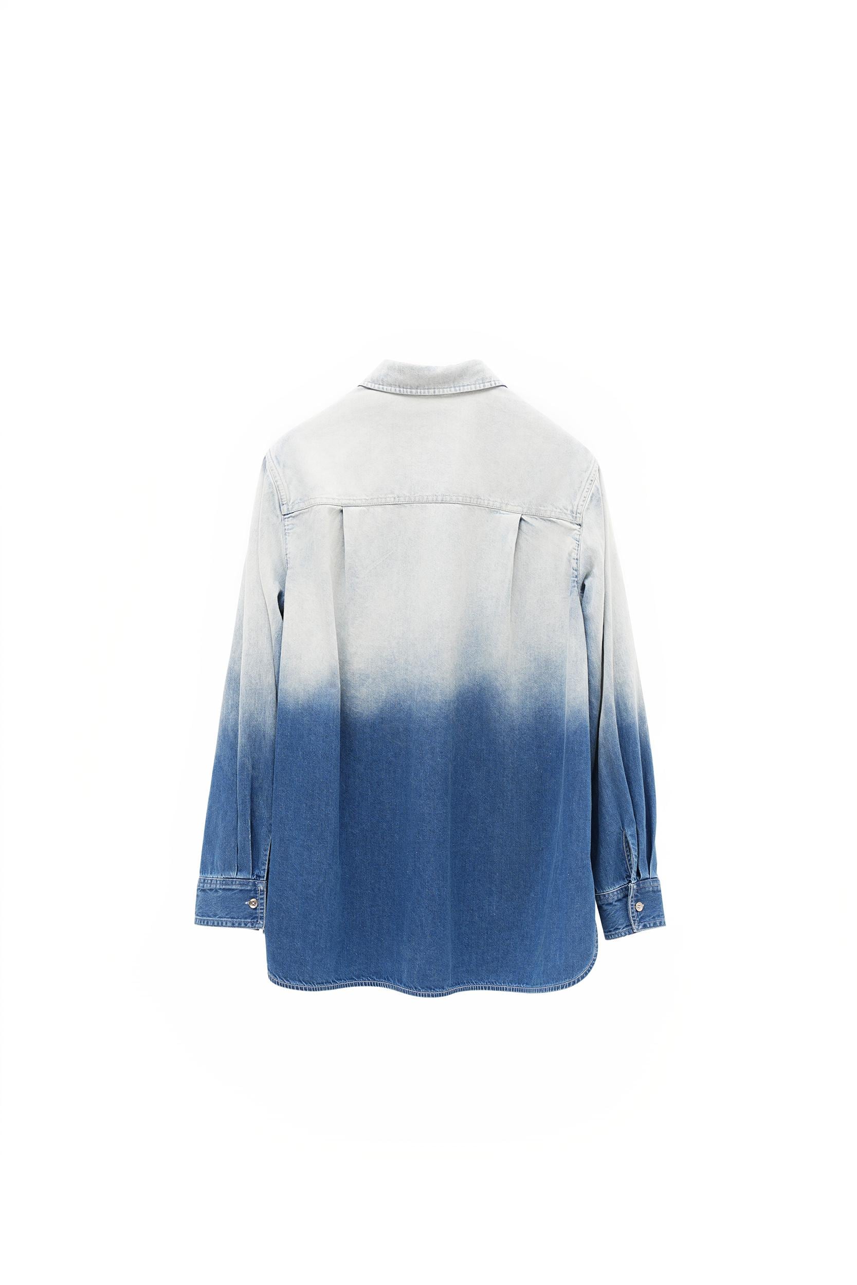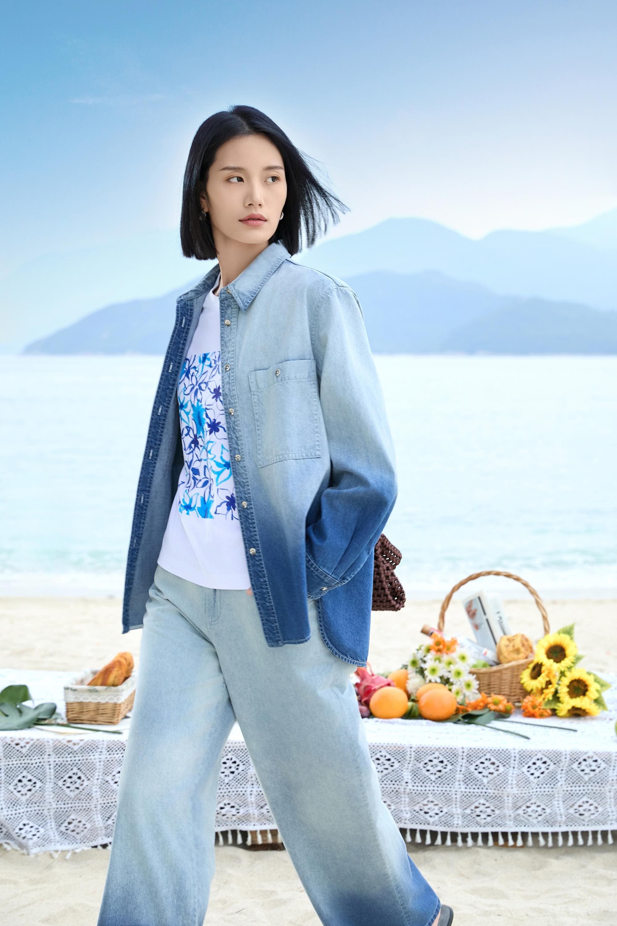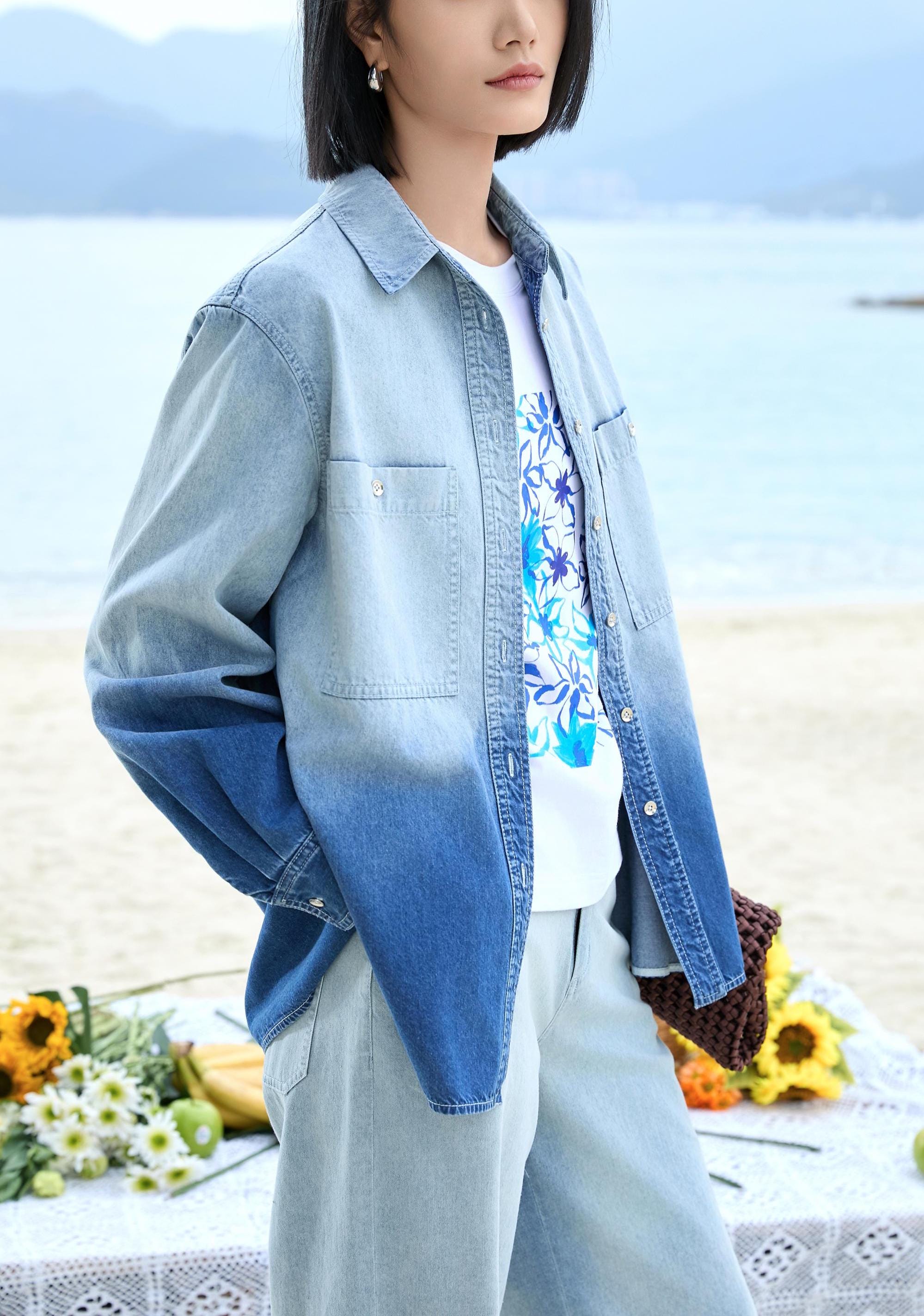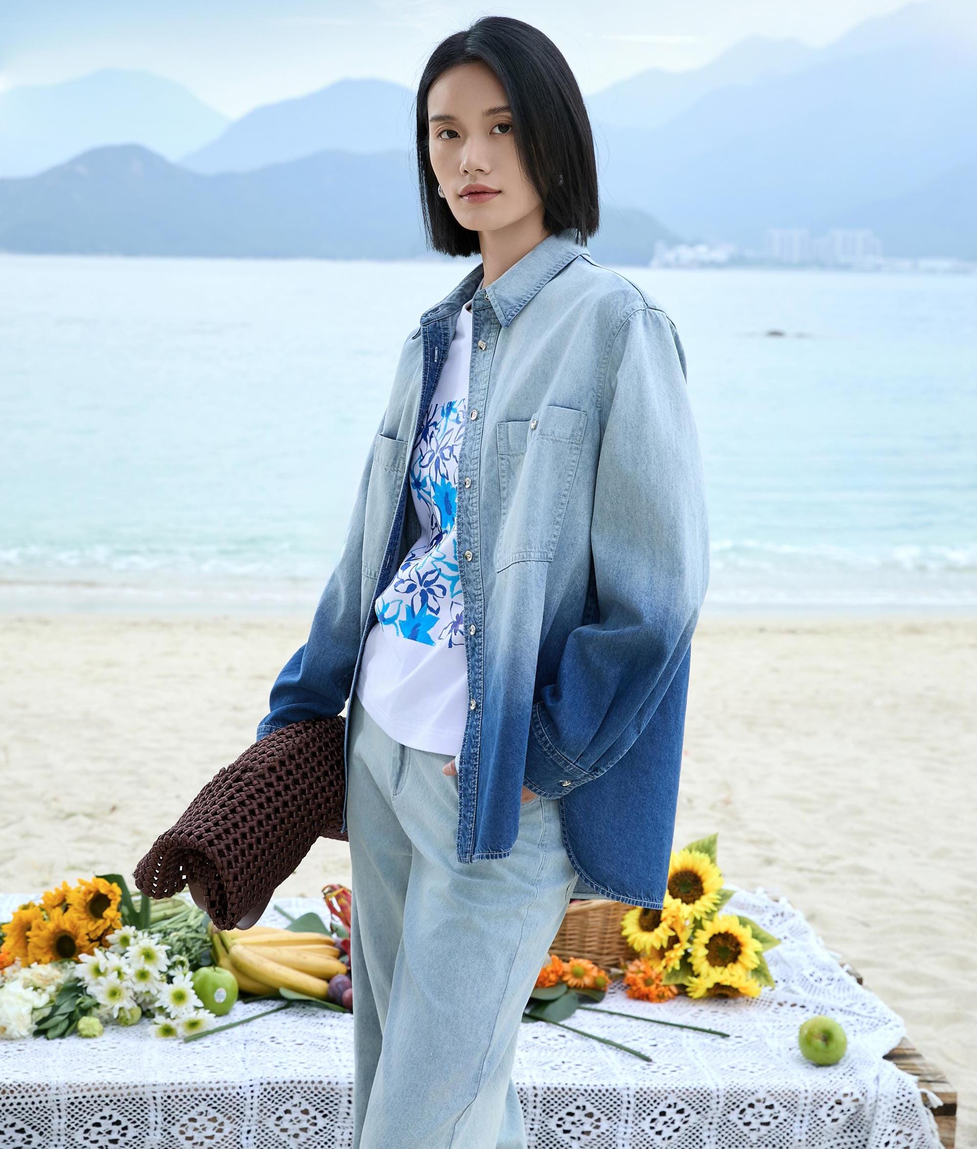 Gradient Blue Denim Shirt & Wide-Leg Jeans Set: Faded Wash, Chest Pocket, Slim Fit for Women, blue denim shirt, gradient denim shirt women