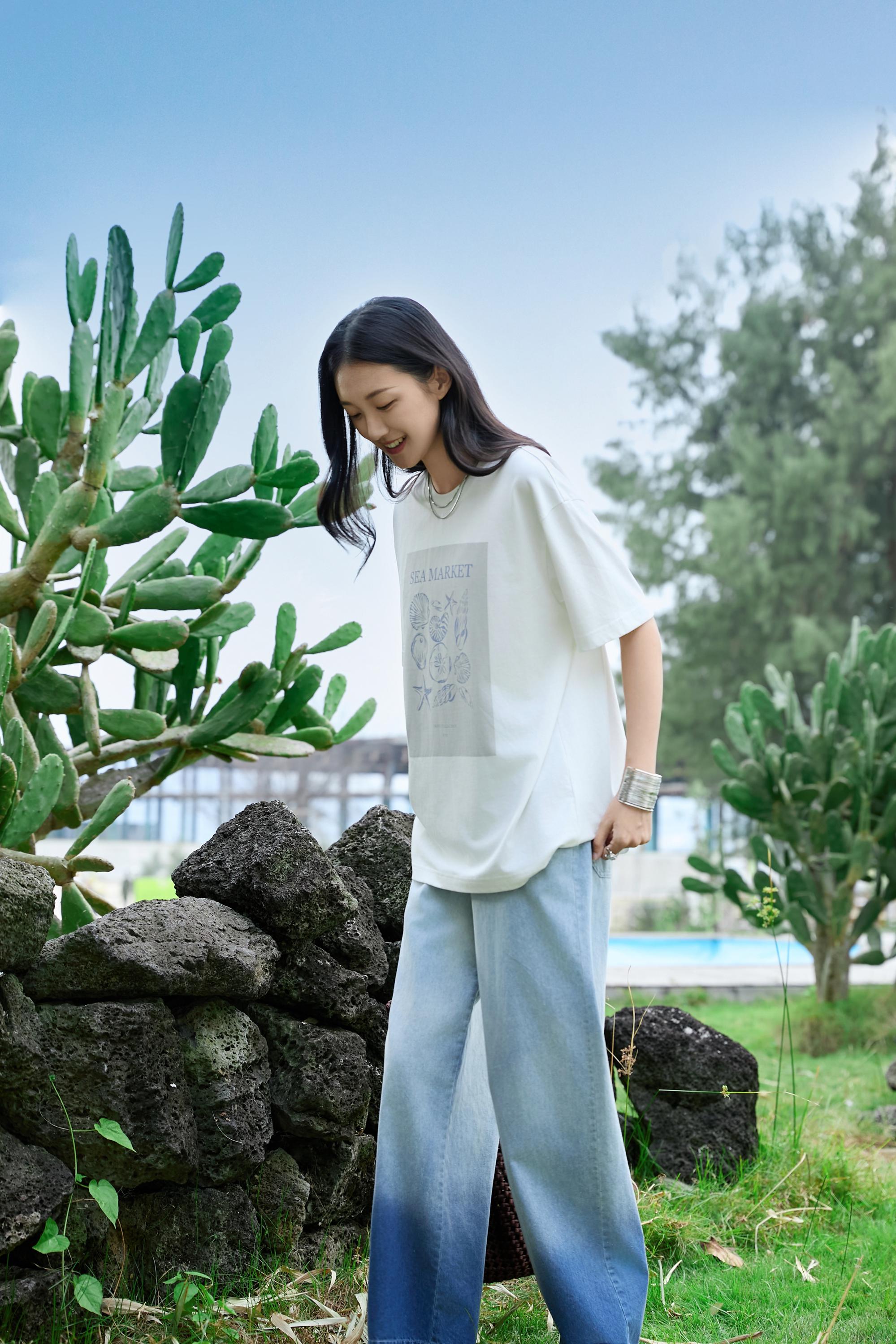 Tidal Texture: The “Horizon Fade dye technique transitions from sun-bleached sky blue at the waist to deep abyssal navy at the hem, mirroring coastal twilight. Cut from 12oz mid-weight denim, these wide-leg jeans balance structure and flow for all-day comfort.
