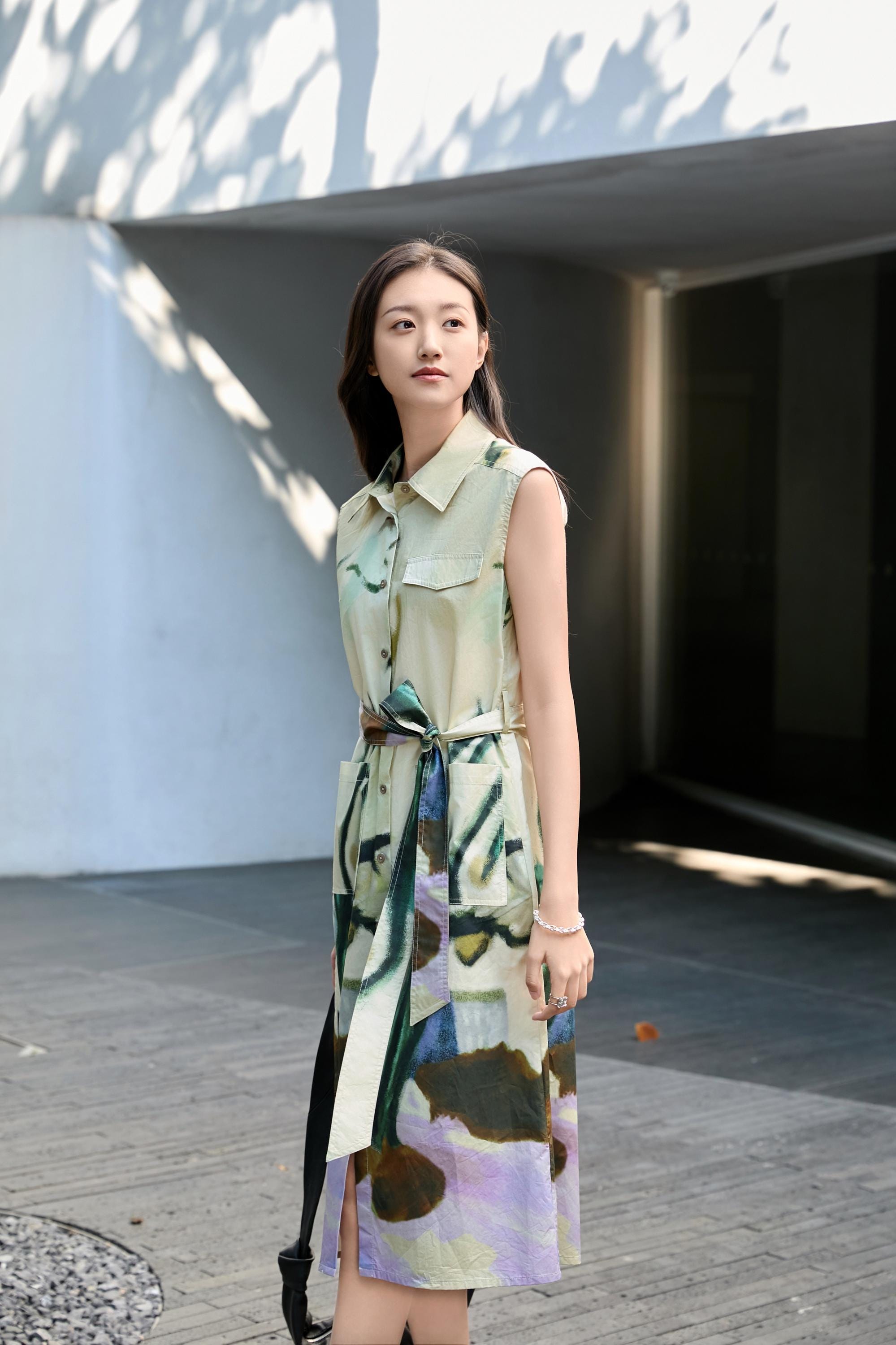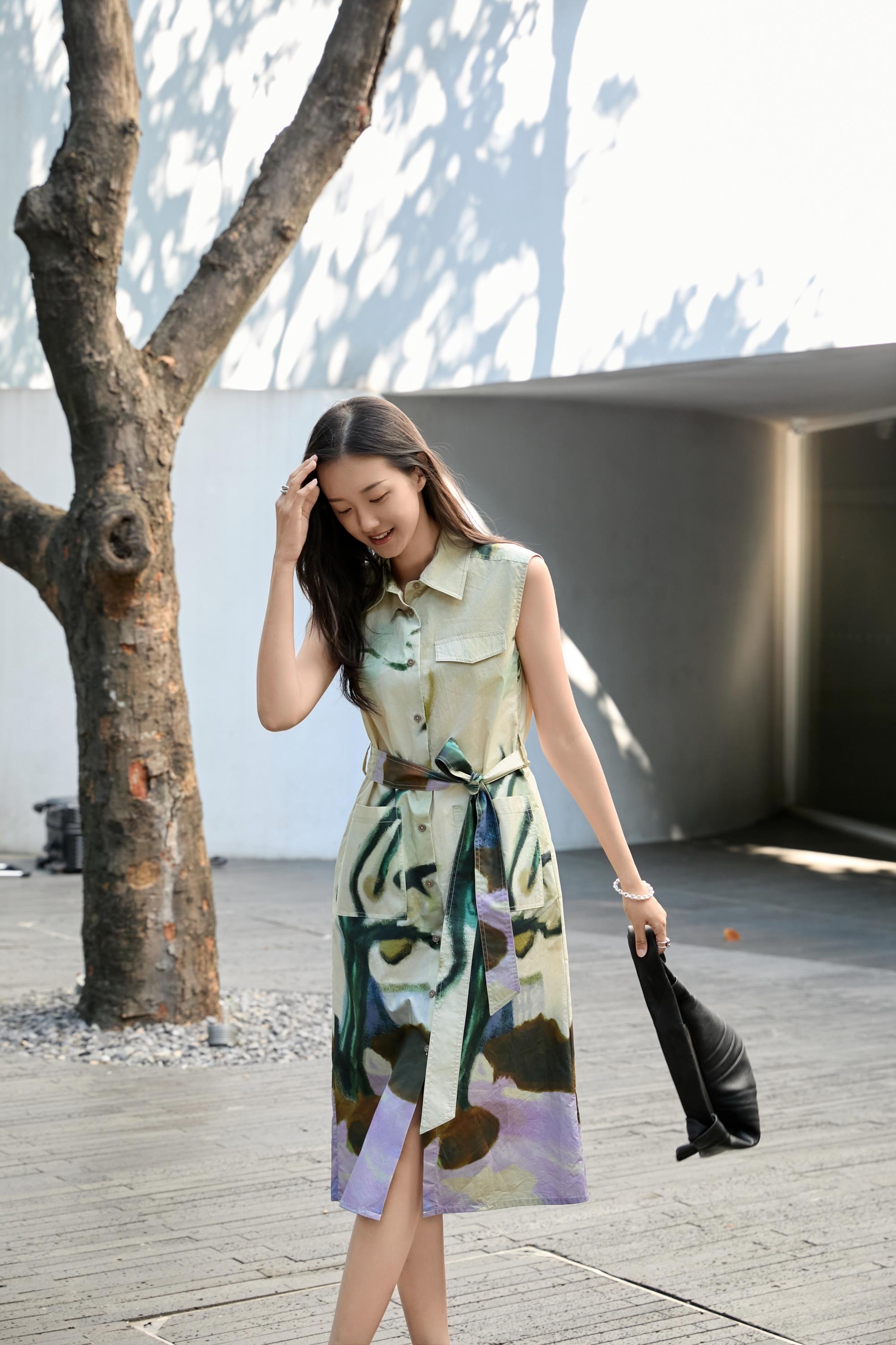 Ink-Dyed Sleeveless Cotton Dress with Abstract Print, Adjustable Waist, and Side Pockets, green dress, pure cotton, abstract print dress