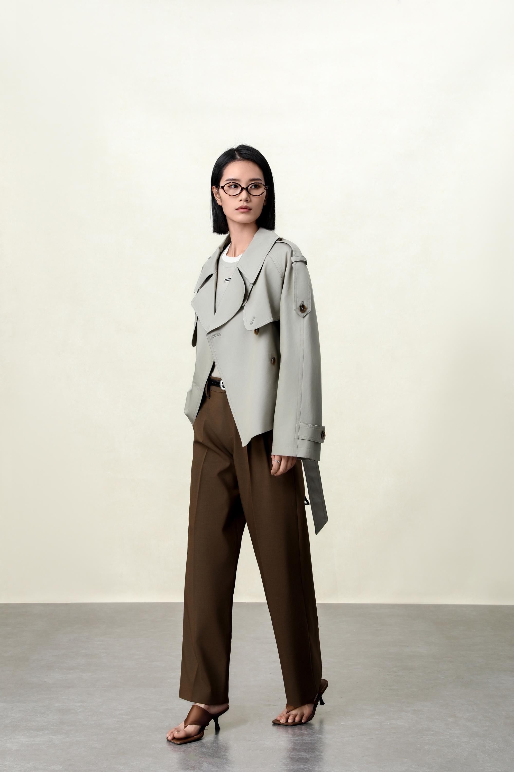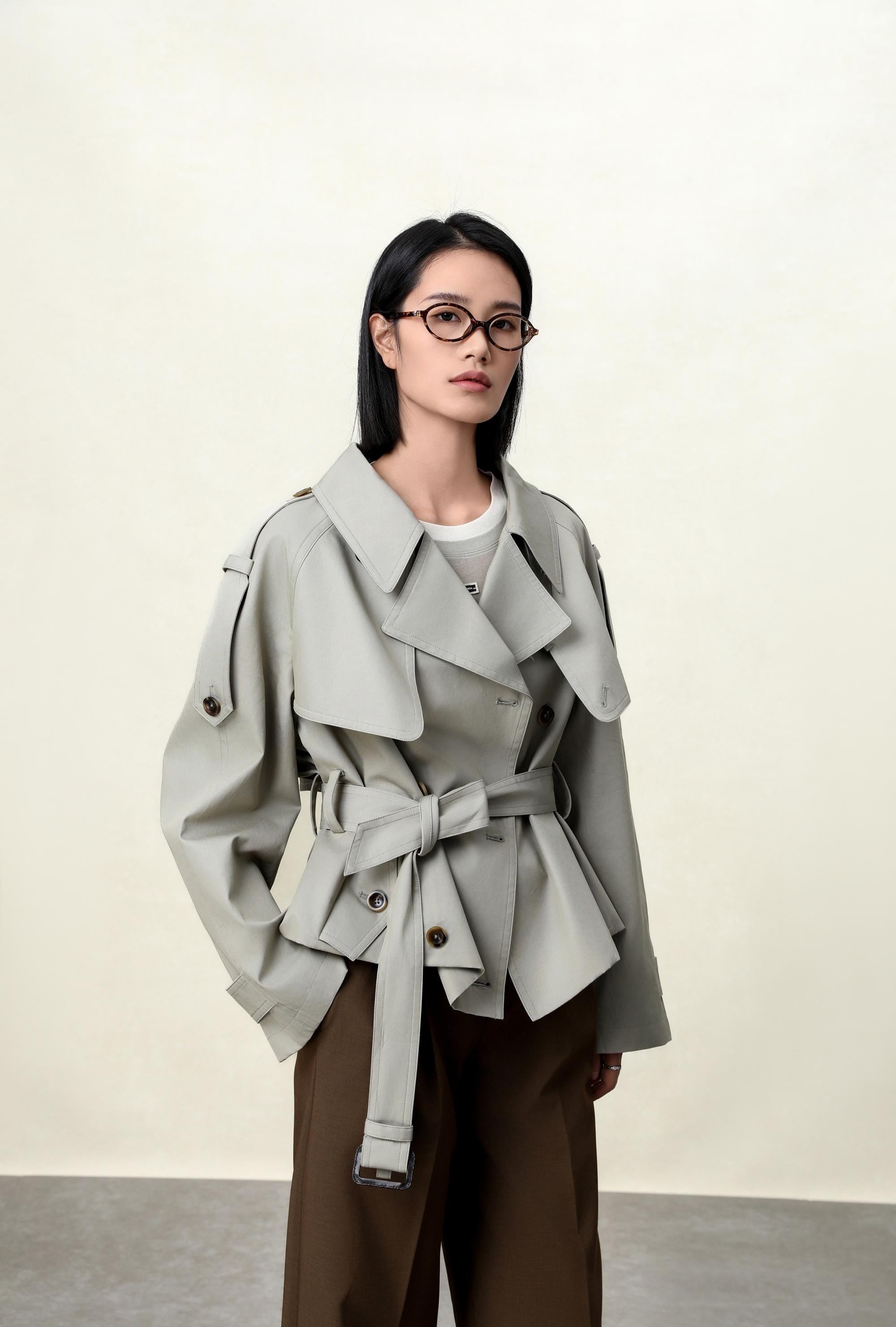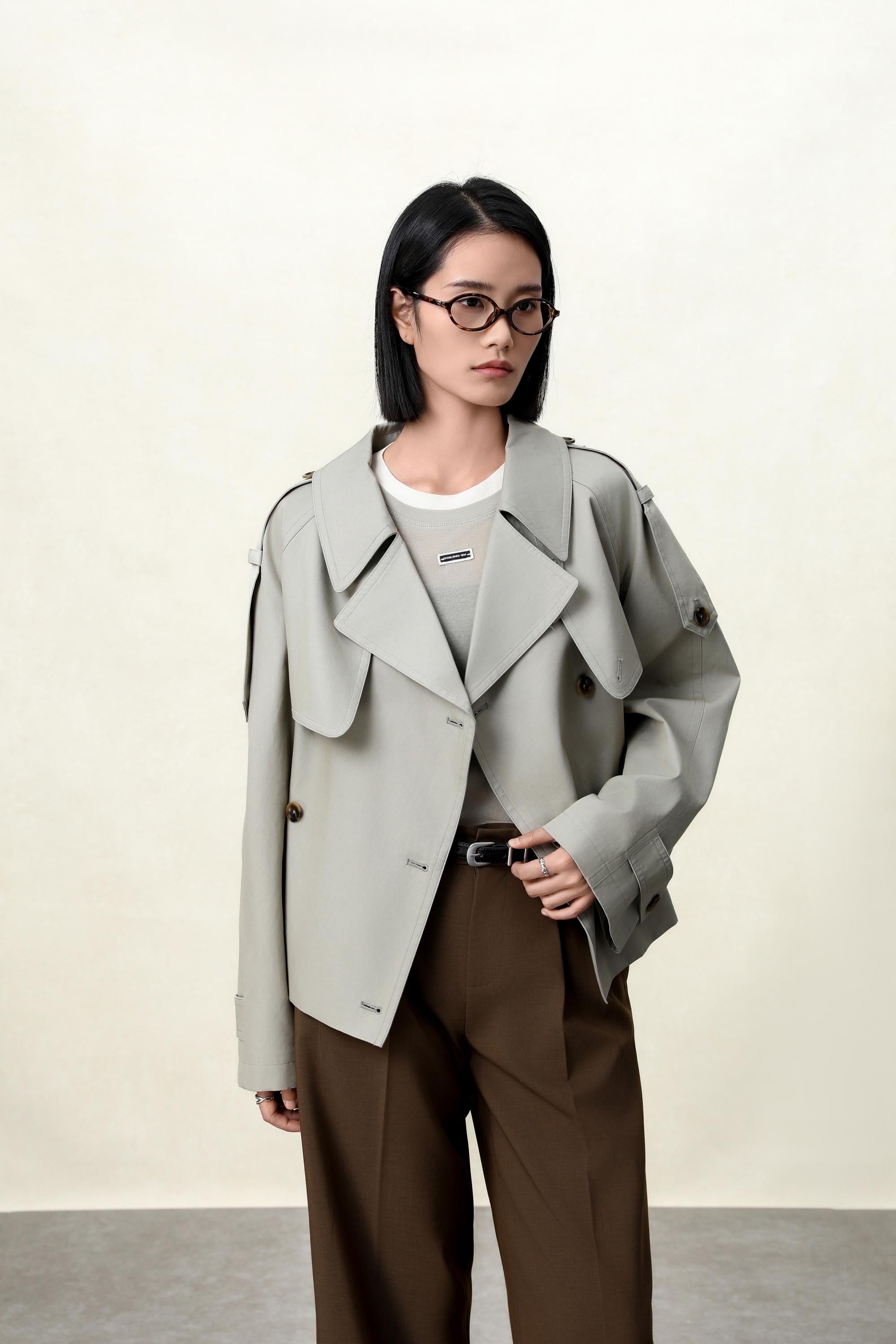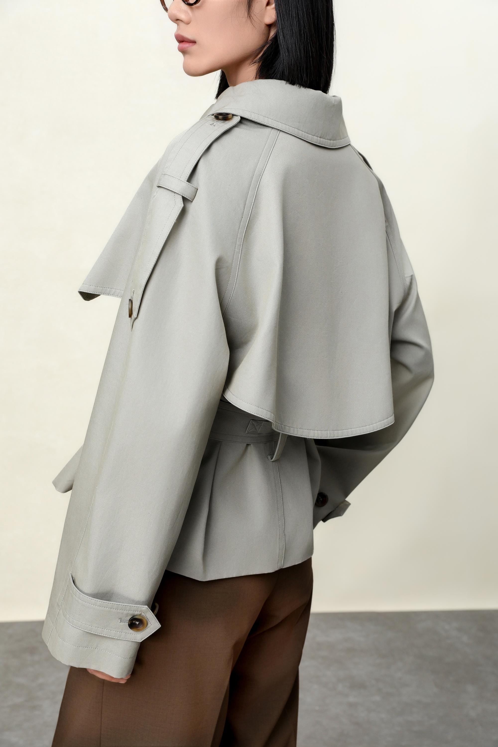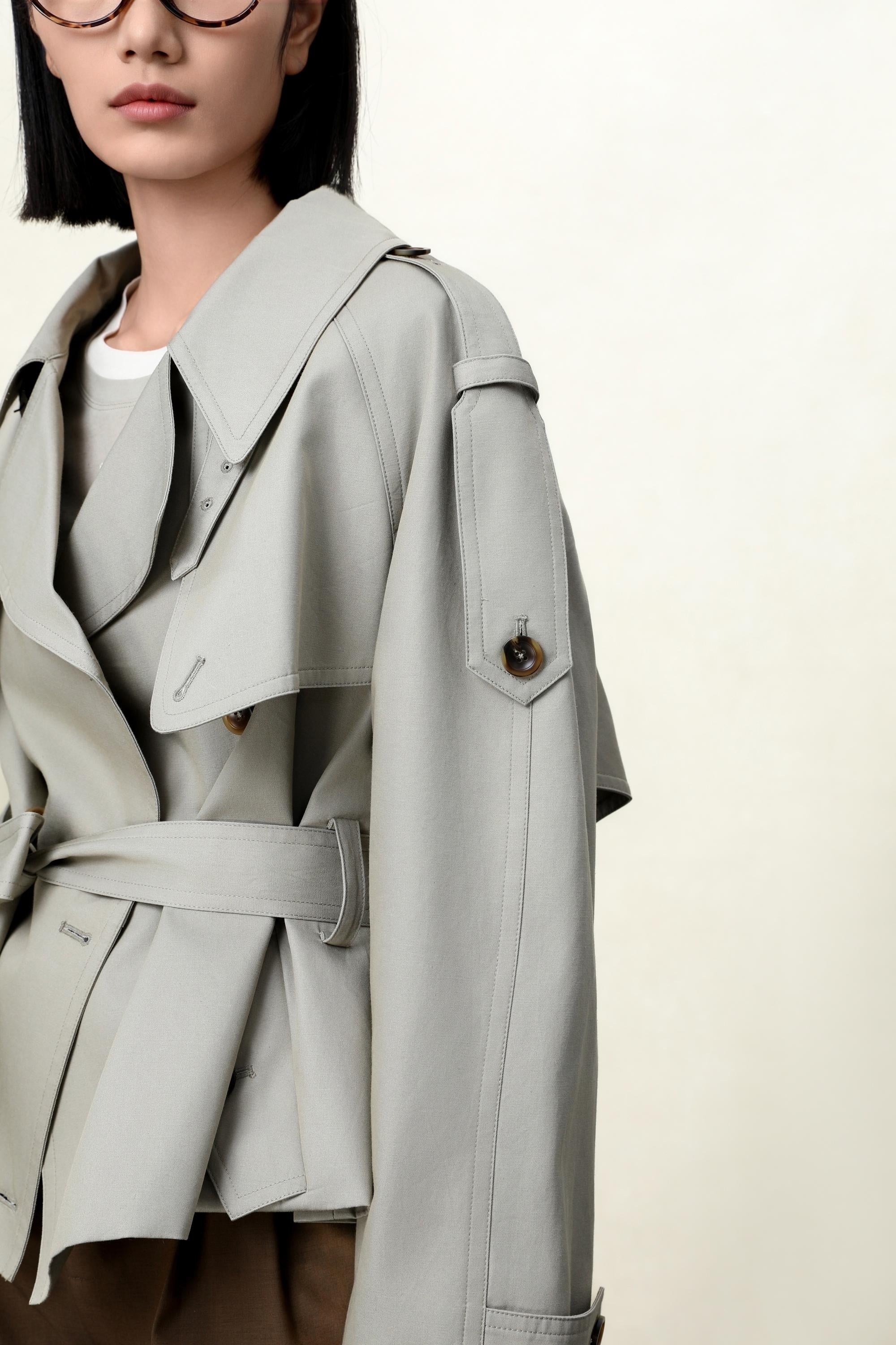 Water-Repellent Military-Inspired Double Breasted Sage Gray Trench Coat for Women | Cotton-Hemp Blend