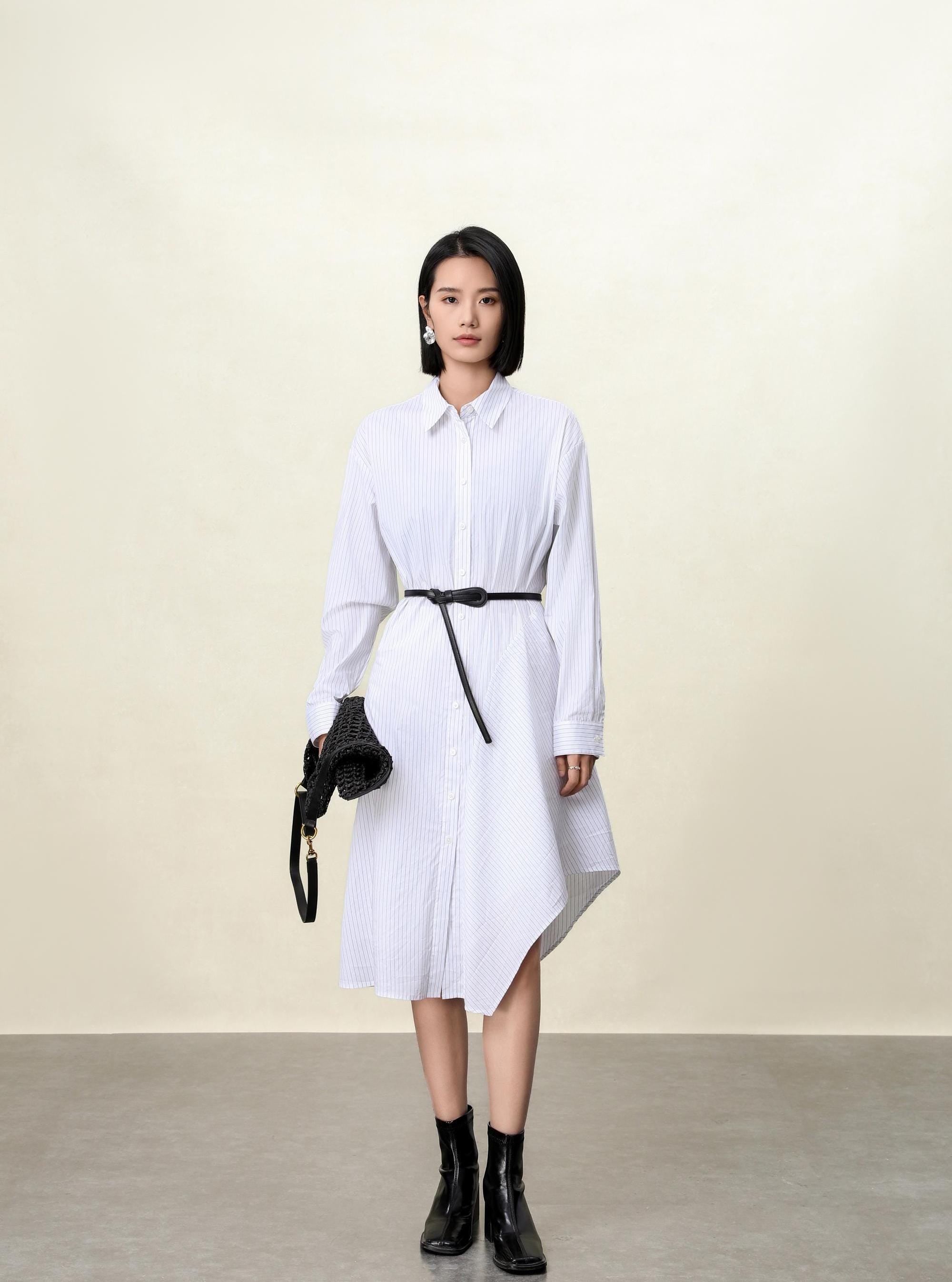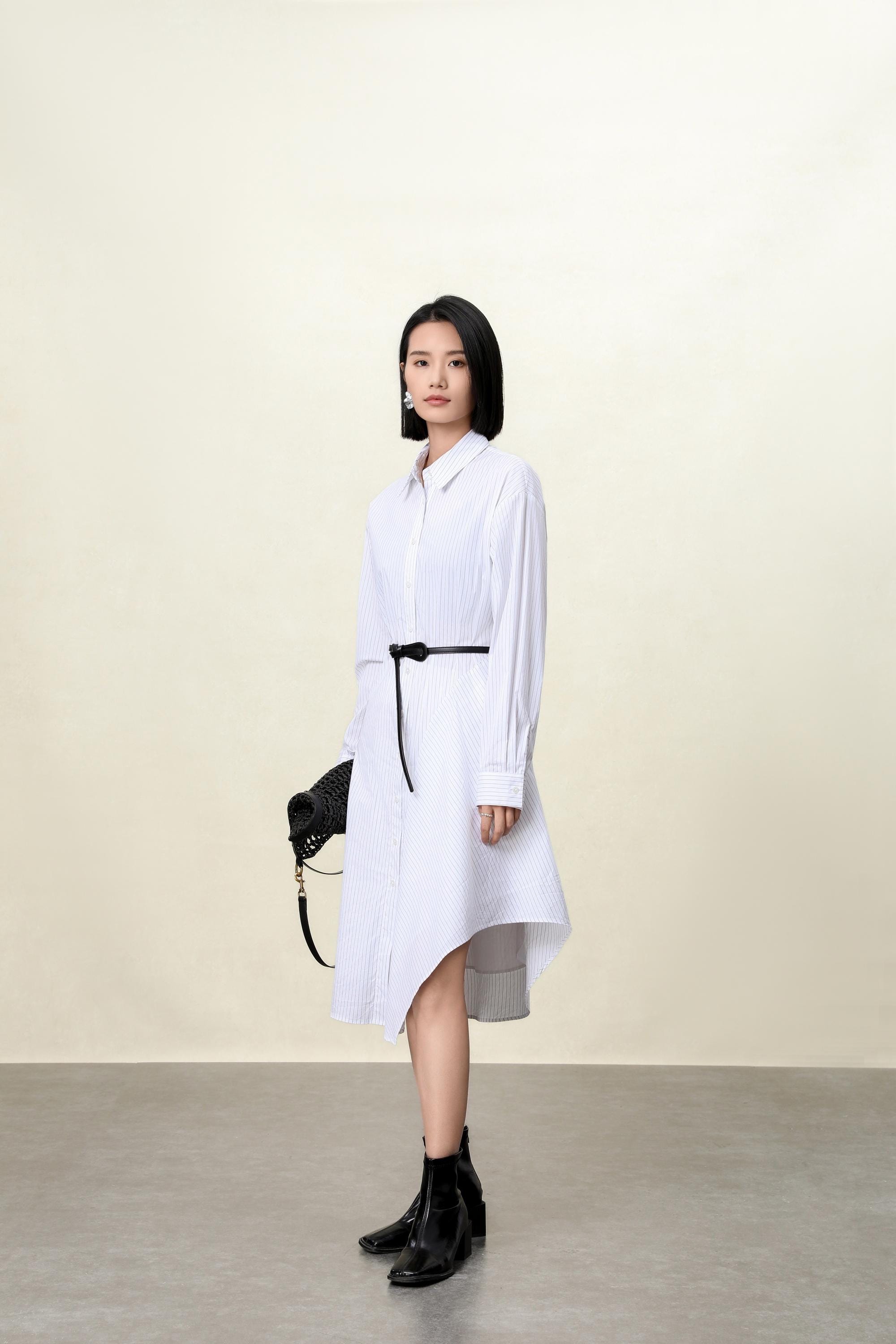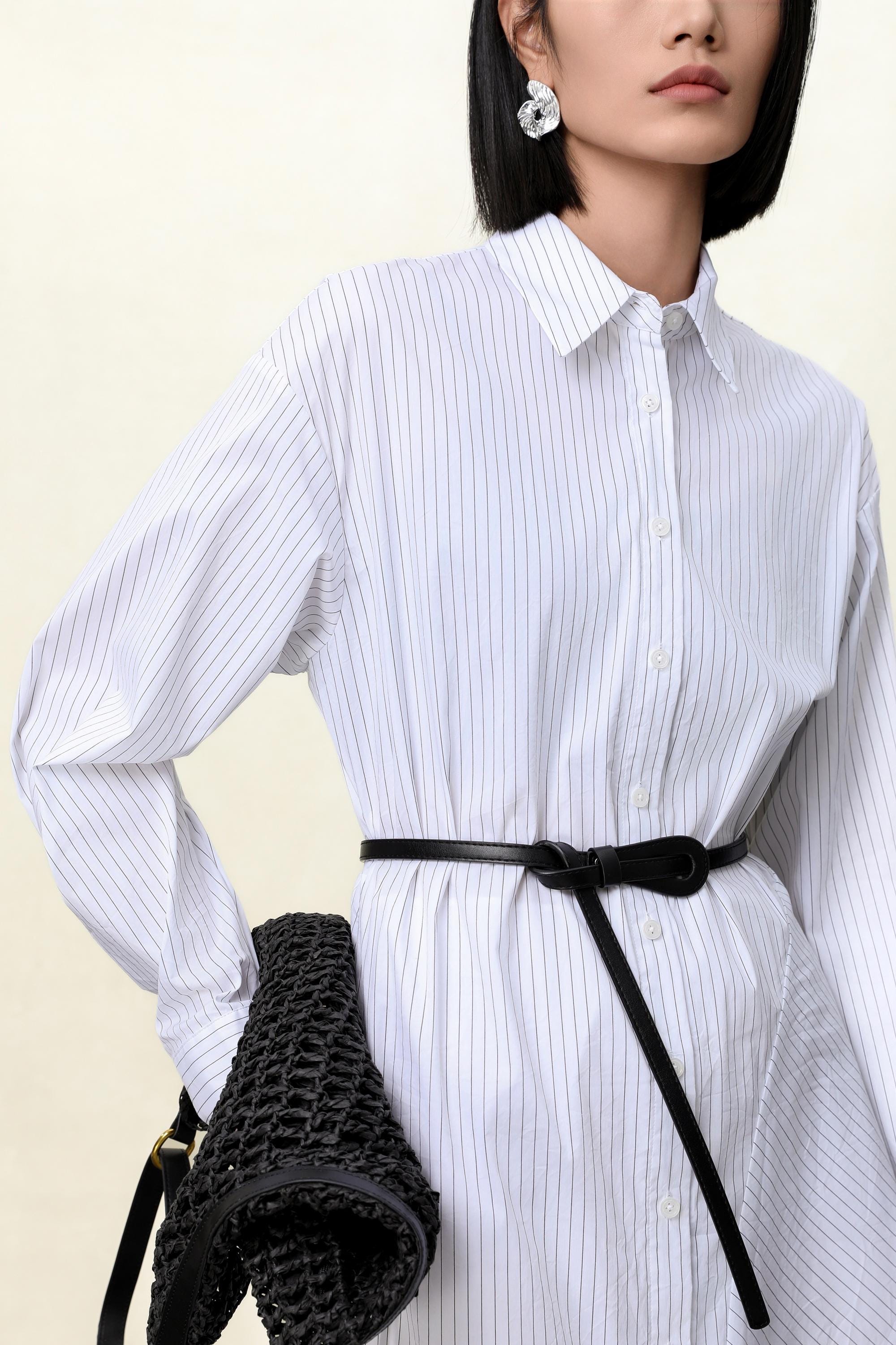 White Vertical Stripe Shirt Dress | Slimming Cotton-Blend | Longline Office-to-Resort Wear