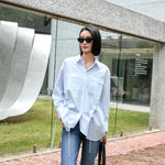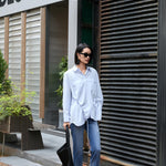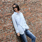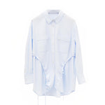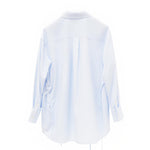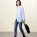 Elegant Blue Tailored Women's Blouse with Cinched Waist | Washed Poly-Cotton Contouring Shirt